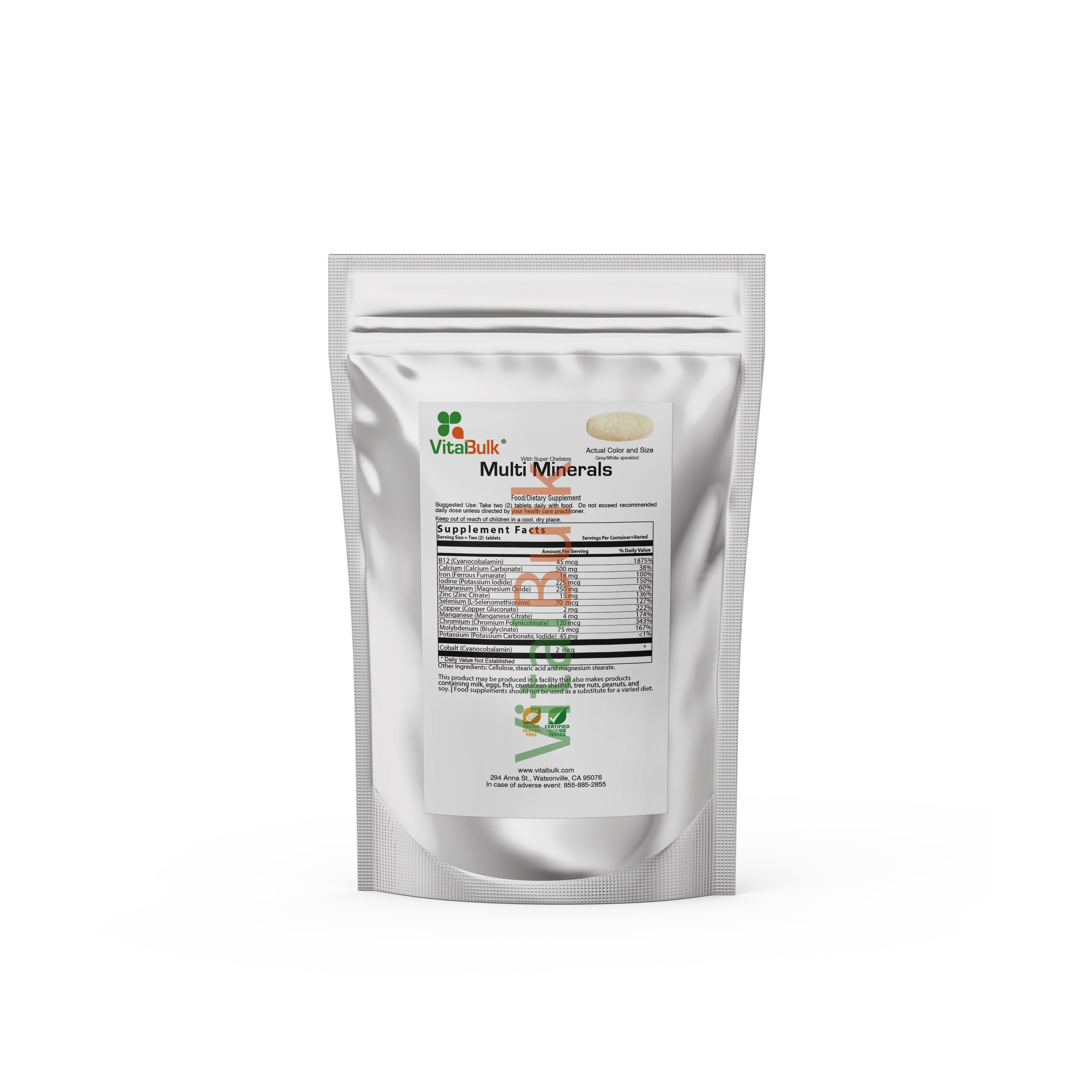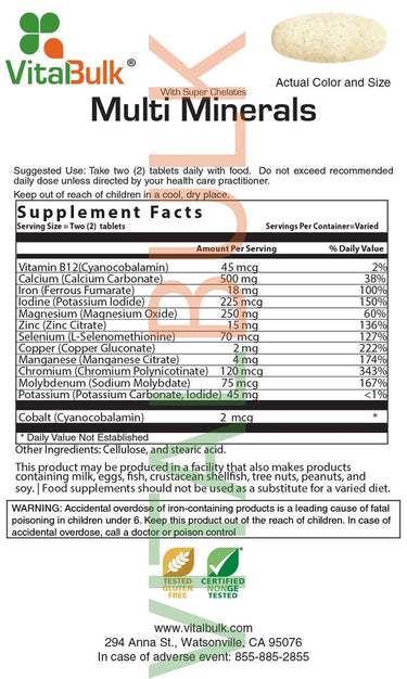 Calcium (as Calcium Carbonate) 500mg., Iron (as Ferrous Fumarate) 18mg., Magnesium (as Magnesium Oxide) 250mg., Manganese (as Manganese Citrate) 4mg., Zinc (as Zinc Citrate) 15mg., Potassium (as Potassium Carbonate Iodide) 45mg., Copper (as Copper Gluconate) 2mg., Chromium (as Chromium Polynicotinate) 120mcg., Iodine (as Potassium Iodide) 225ug., Selenium (as L-Selenomethionine) 70mcg., Molybdenum (as Sodium Molybdate) 75mcg., Cobalt (as Cobaltus Chloride hexahydrate)2mcg.,  Other Ingredients:  Cellulose, stearic acid, titanium oxide, ethylene oxide, magnesium stearate, silicon dioxide, sodium citrate, & polysorbate.