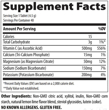 Vitamin C (as Ascorbic Acid), Non-GMO citric acid, xylitol, inulin, Non-GMO corn starch, natural lemon lime flavor blend, steviol glycosides, lutein (color), Calcium (Tri-Calcium Phosphate), Magnesium (as Magnesium Citrate), Sodium (Sodium Bicarbonate), Potassium (Potassium Bicarbonate).